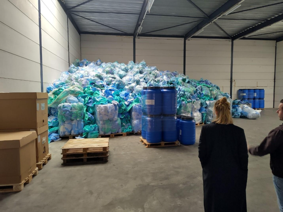 The team visited a waste processing plant for one of the interviews. Disposable waste from 2 weeks out of 15 hospitals, only blue wraps packaging material from sterilization sets in operating room, an imposing sight.