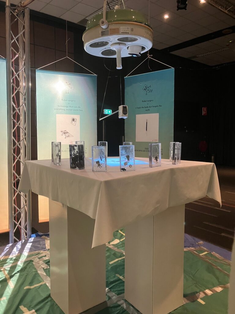 The artwork did not aim to instruct or persuade. Instead, it invited participants to pause and consider the relationship between high-tech, patient-centred care and its broader environmental impact. Researchers studied these encounters through pre- and post-assessments and in-depth conversations, exploring how evidence-based environmental and social information resonates with healthcare professionals.